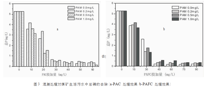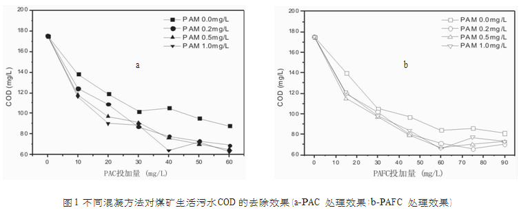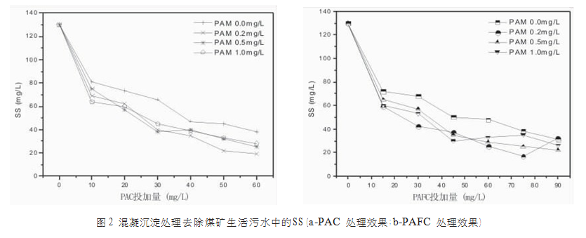 試驗主要考察混凝劑種類與投加量對煤礦生活污水中主要污染物的去除效果,混凝劑以PAC、PAFC 為主, 污染物包括COD、SS、TP。試驗均在1 L 燒杯中攪拌進行,混凝反應20 min,絮凝反應20 min,反應結束后取上清液測定水質指標。