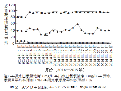 1)采用 A2/O+ MBR 工藝對(duì)城鎮(zhèn)污水處理廠進(jìn)行深度改造,氨氮的處理效果相對(duì)較好,尤其在污水濃度沖擊力較大、冬季溫度較低時(shí)間段處理效果更加明顯。