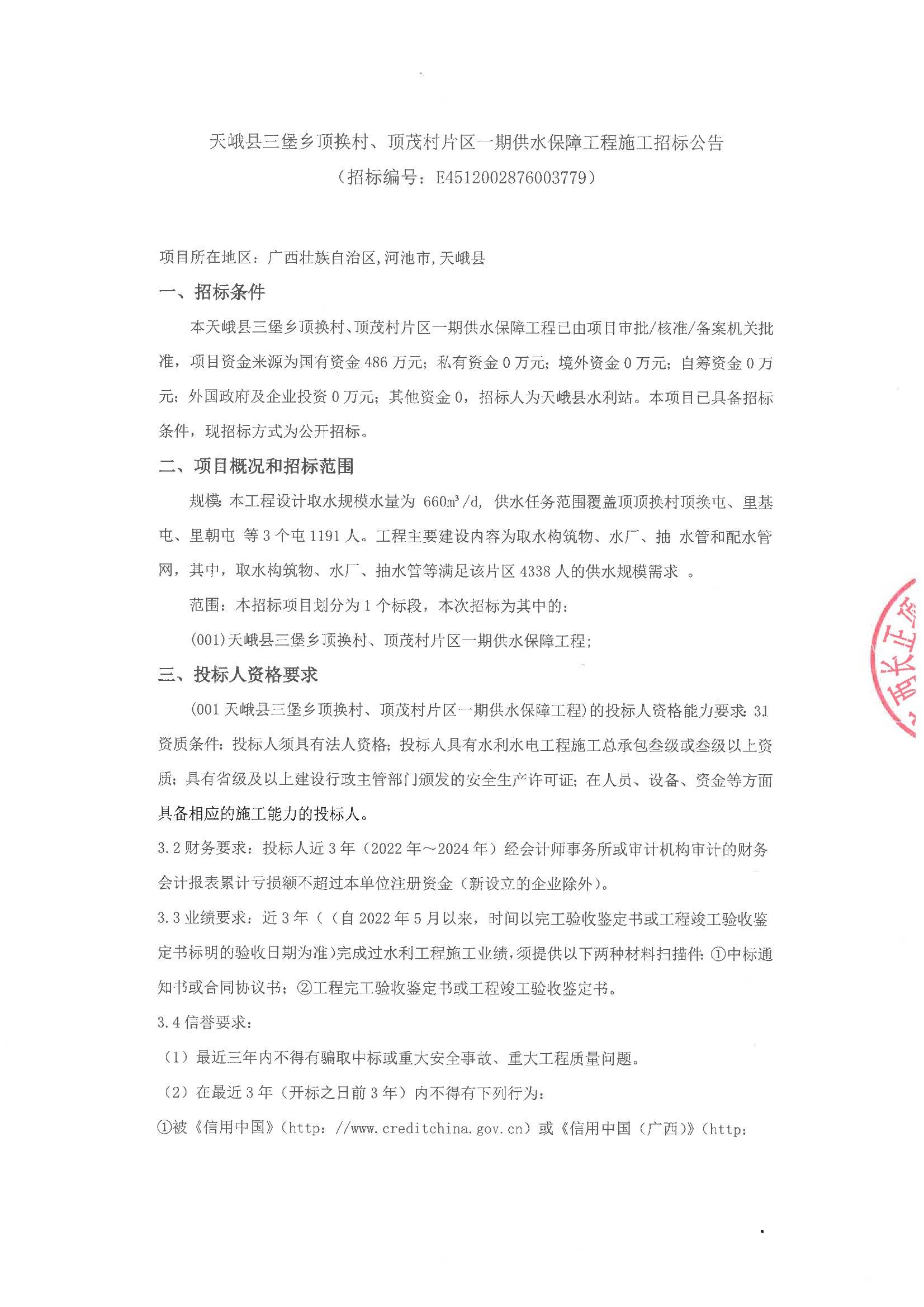 廣西天峨縣三堡鄉頂換村、頂茂村片區一期供水保障工程施工招標公告