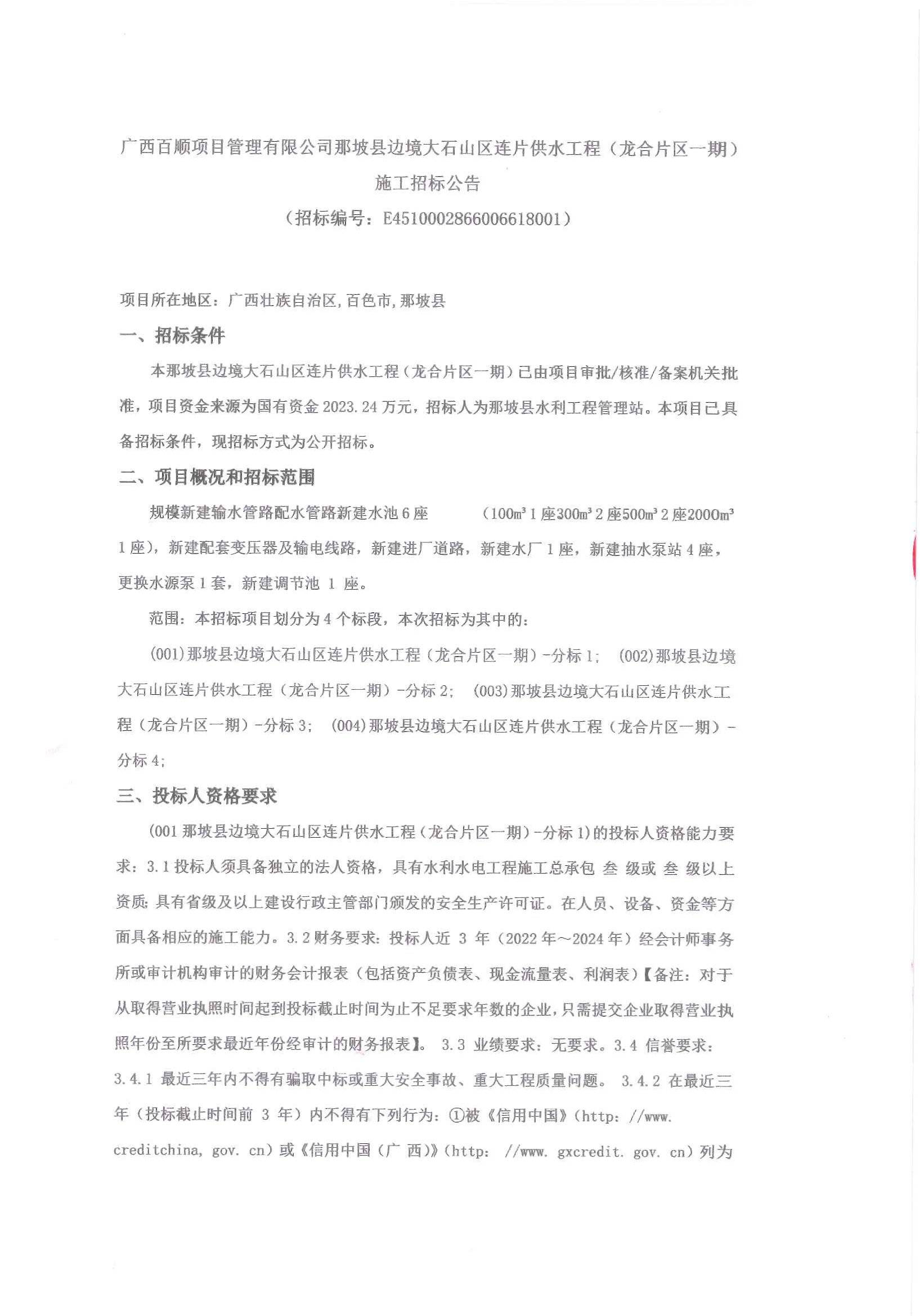 廣西百順項目管理有限公司那坡縣邊境大石山區連片供水工程(龍合片區一期)施工招標公告...