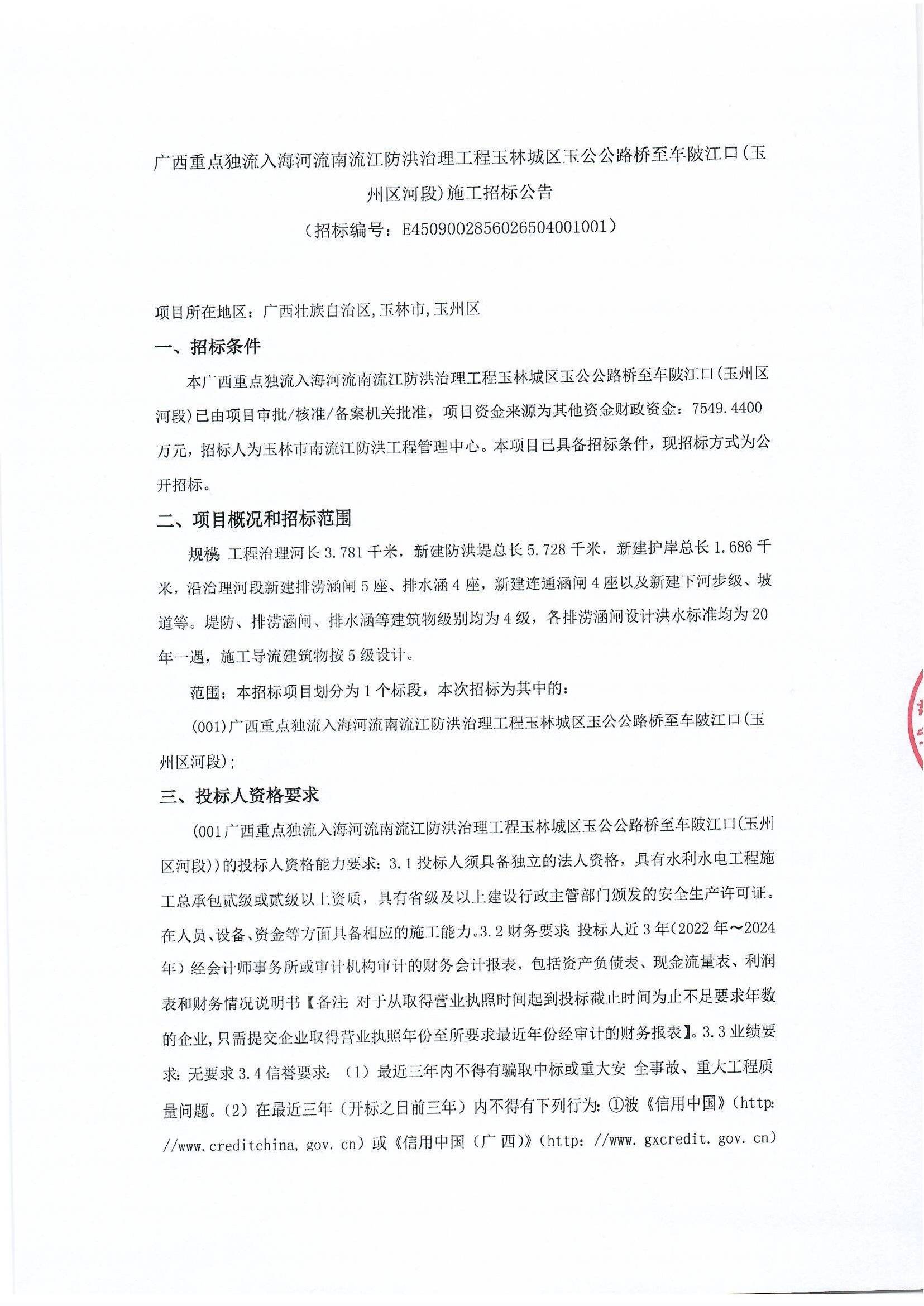 廣西重點(diǎn)獨(dú)流入海河流南流江防洪治理工程玉林城區(qū)玉公公路橋至車陂江口(玉州區(qū)河段)施...