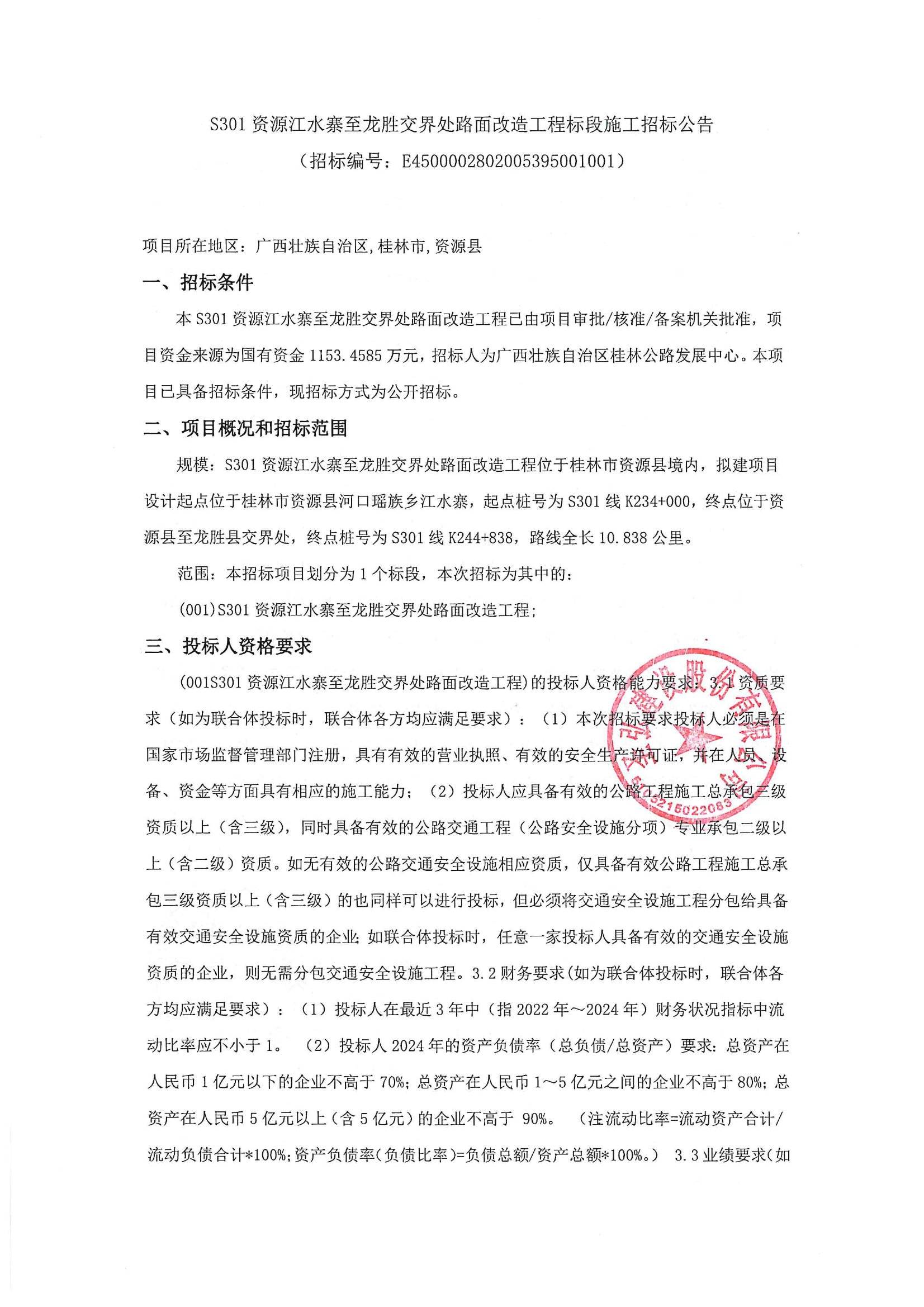 廣西S301資源江水寨至龍勝交界處路面改造工程標段施工招標公告