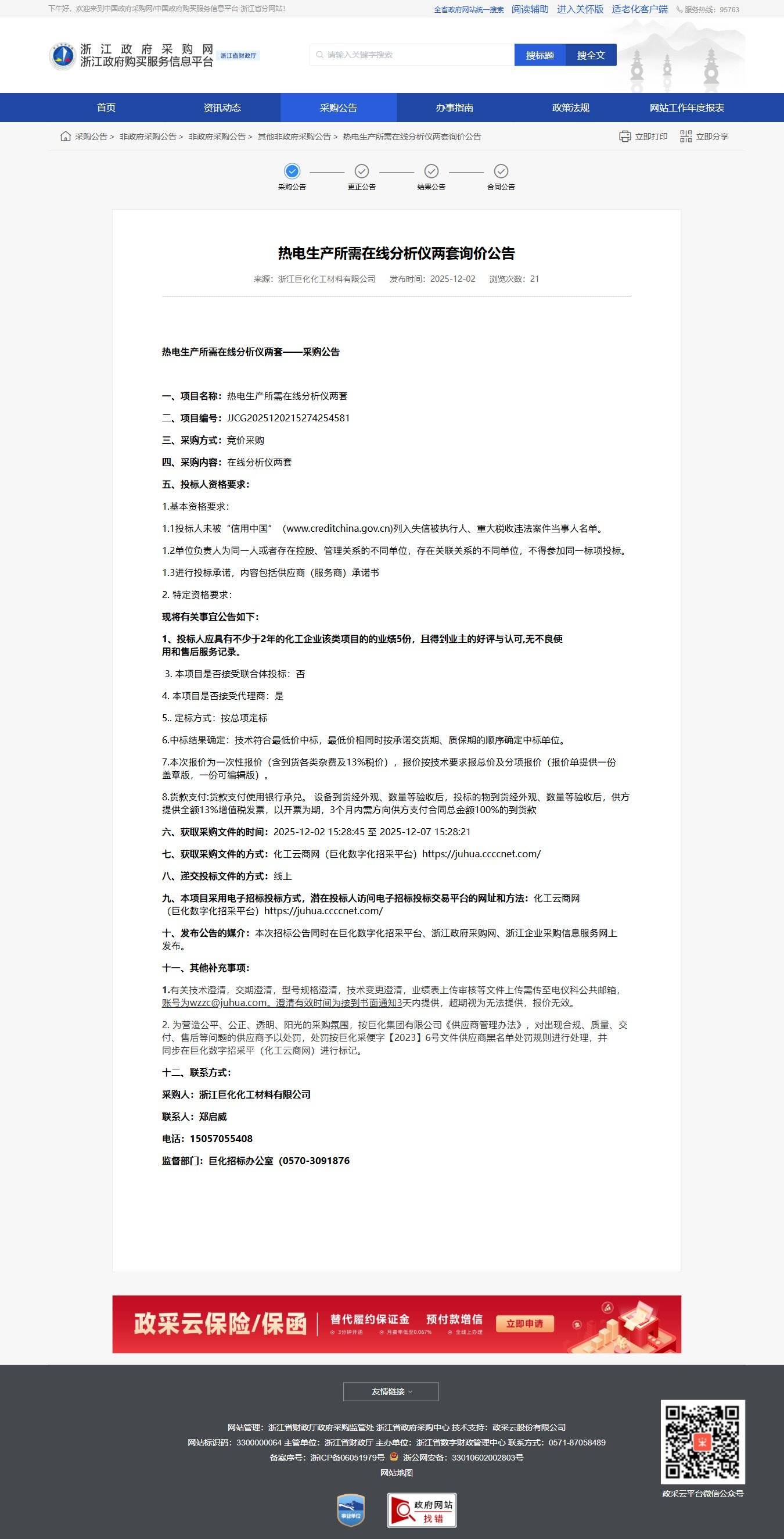 浙江熱電生產所需在線分析儀兩套詢價公告
