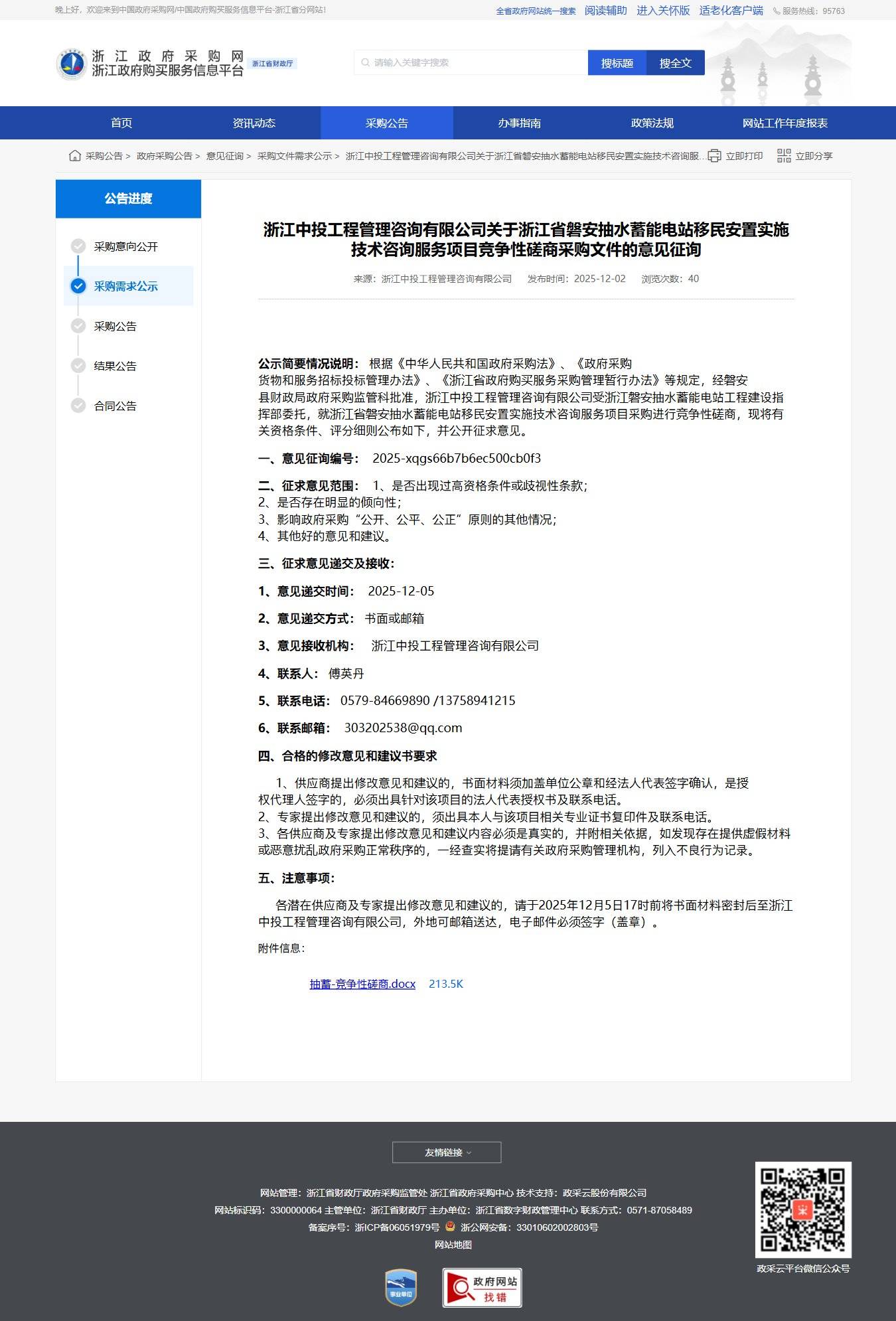 浙江關于浙江省磐安抽水蓄能電站移民安置實施技術咨詢服務項目競爭性磋商采購文件的意見征詢