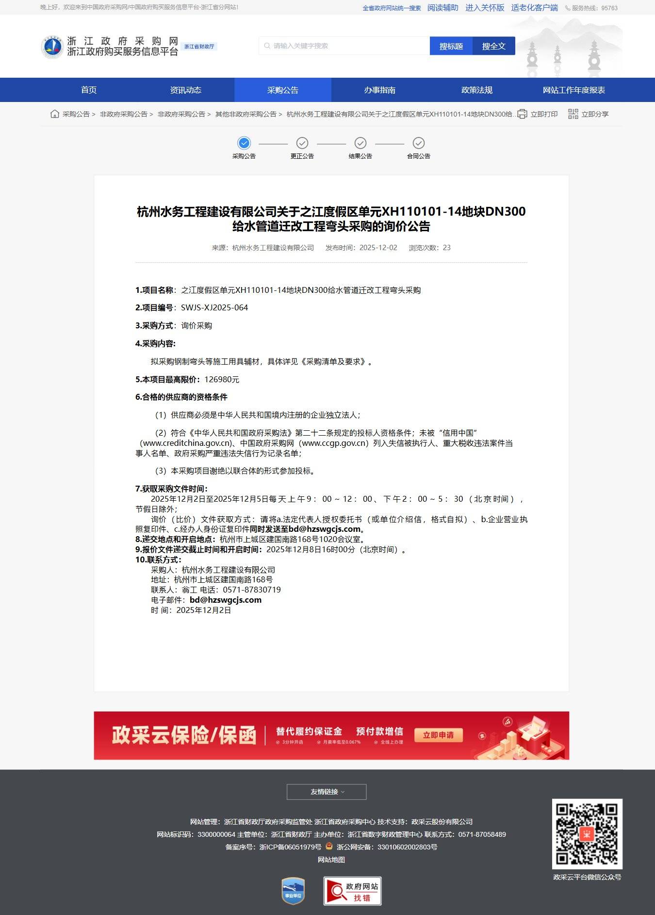 浙江關于之江度假區單元XH110101-14地塊DN300給水管道遷改工程彎頭采購的詢價公告