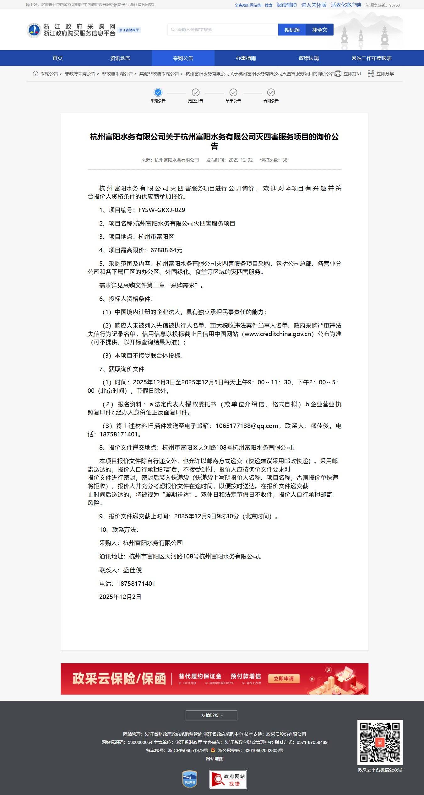 杭州富陽水務有限公司滅四害服務項目詢價公告: