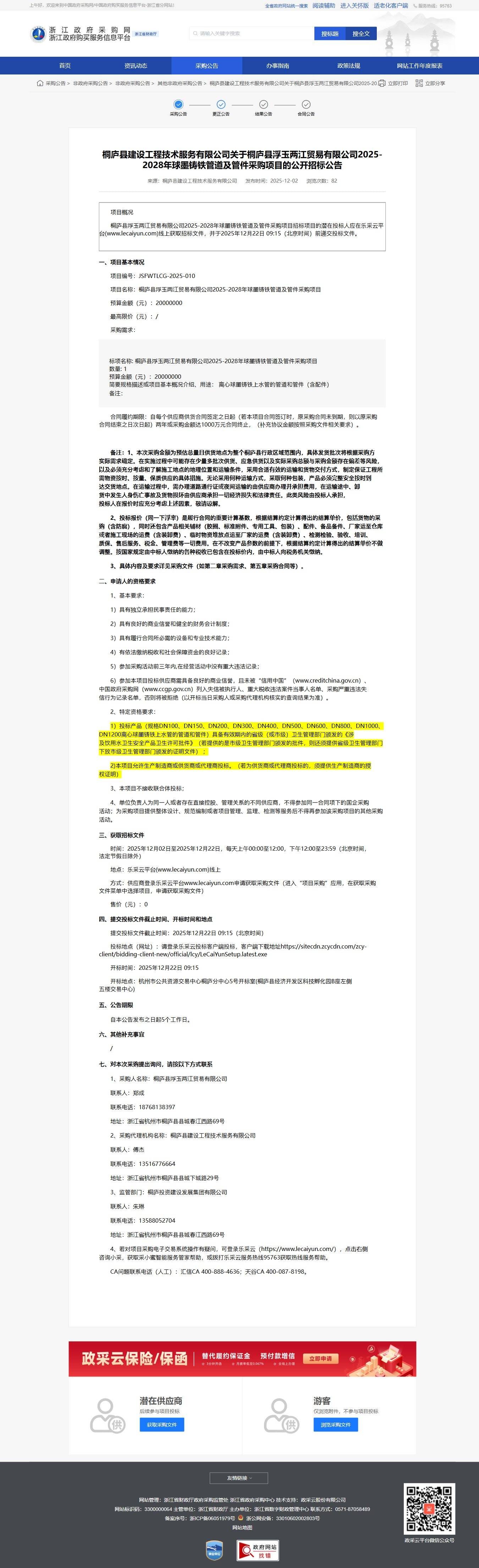 - 項(xiàng)目名稱:桐訪縣澤玉兩江貿(mào)易有限公司2025-2028年球于鑄鐵管道及管件采購項(xiàng)目