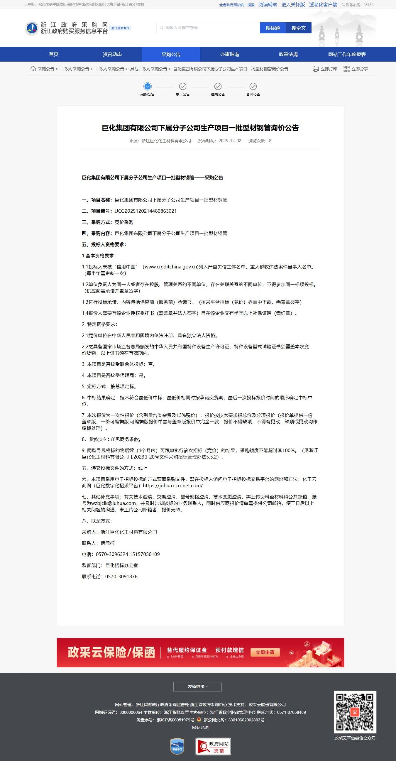 巨化集團有限公司下屬分子公司生產項目一批型材鋼管詢價公告: