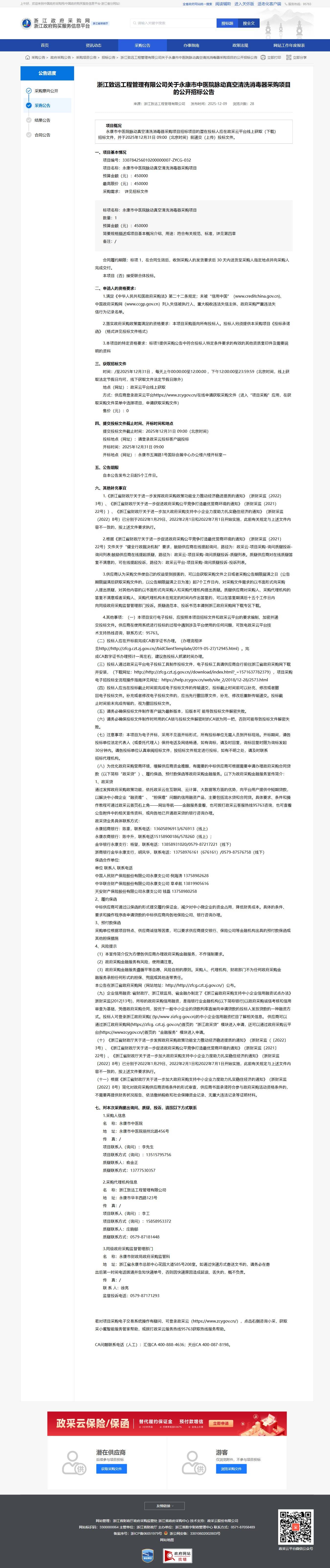 3. 采購需求: 永康市中醫院脈動真空清洗消毒器采購項目,數量: 1,預算金額(元): 450000,簡要規格描述或項目基本概況介紹、用途: 符合有關規范、標準,詳見第四章,備注:/
